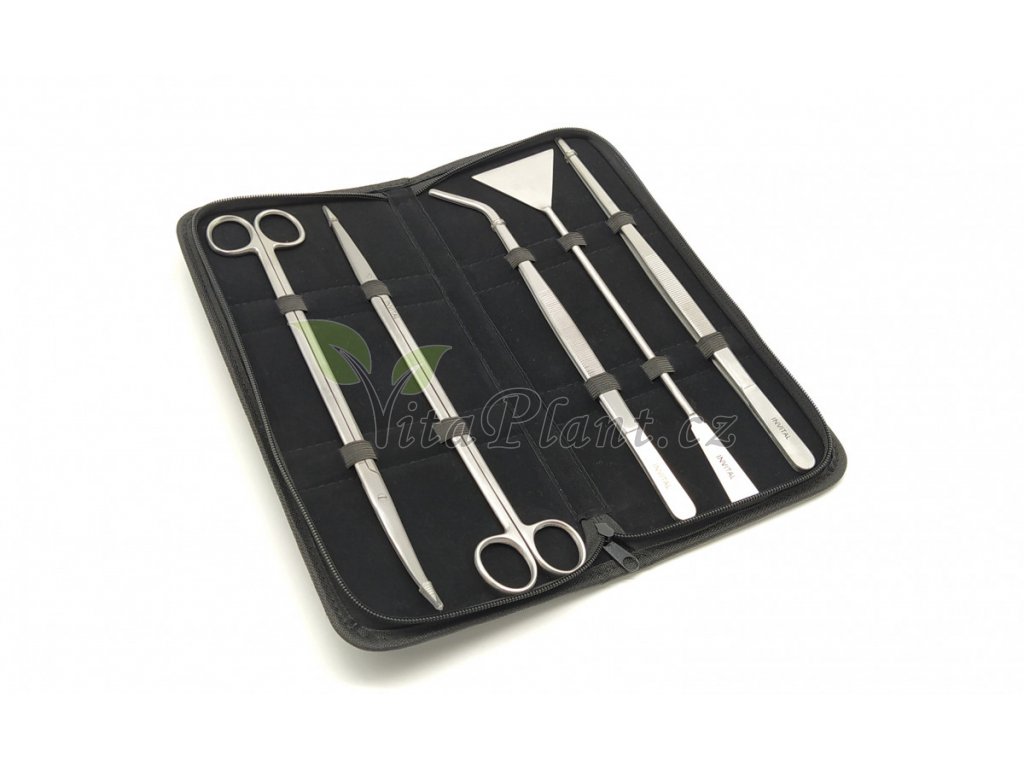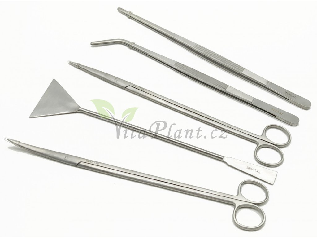 Set pinzet, nůžek a uhlazovačky dna pro údržbu rostlinného akvária.