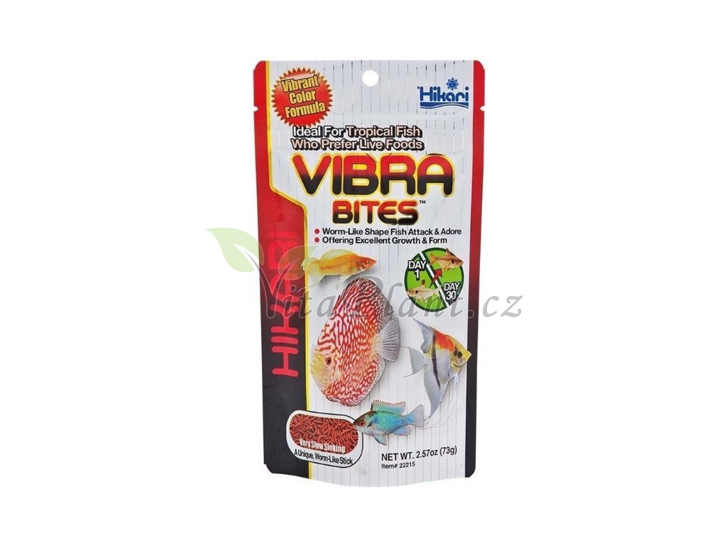 Kompletně bezpečná alternativa krmiva HIKARI® TROPICAL VIBRA BITES ™ bylo vyvinuto tak, aby pelety měly tvar a vzhled živé krvavé patentky, kterou ryby tak zbožňují. Jedinečně vyvážená formulace nabízí výživné hodnoty klasických patentek a přitom neexistuje riziko parazitárních a bakteriálních nákaz. Jedinečné přísady nabízejí vynikající chuť, které ryby neodolají.