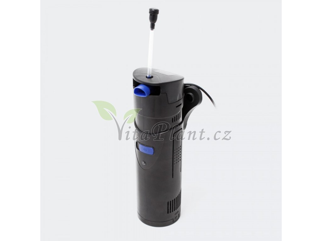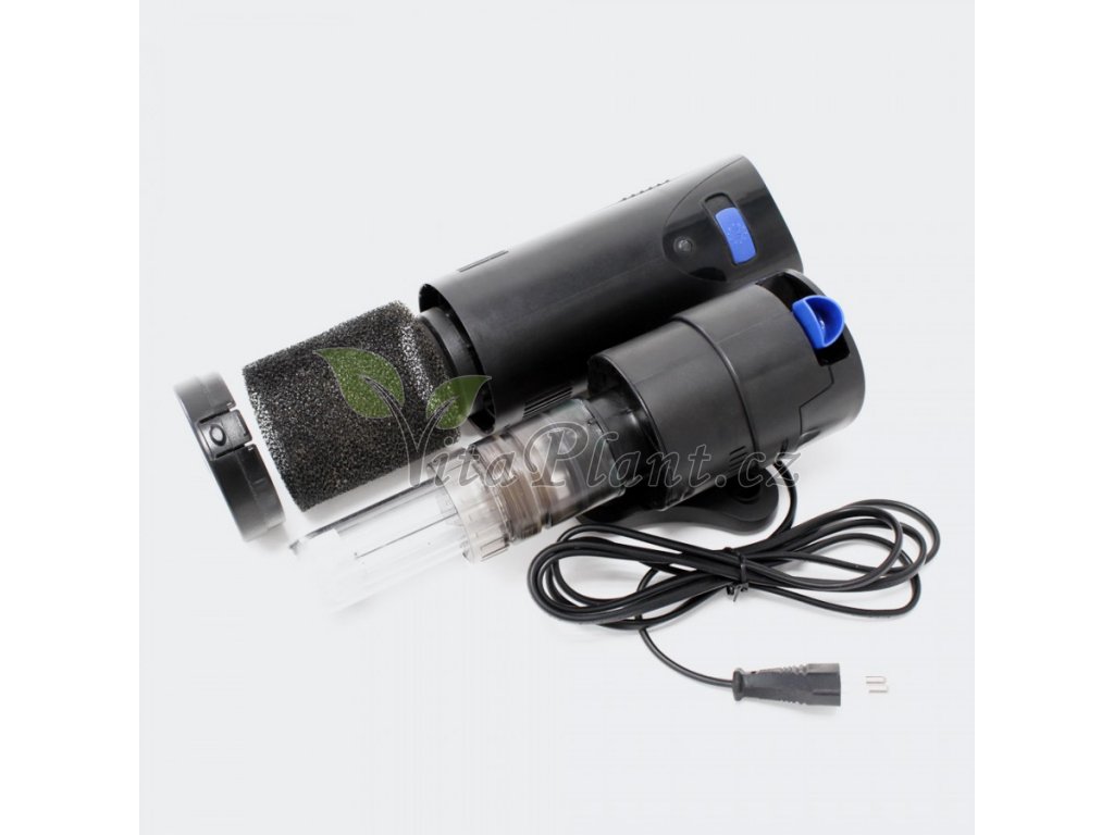- Čerpadlo uvnitř zařízení o maximálním průtoku 700 l/h pumpuje vodu, která prochází přes UV zářivku uvnitř. Ozáření vody zajišťuje 100% sterilizaci - odstranění všech spór řas a jednobuněčných organismů způsobujících zákaly vody.