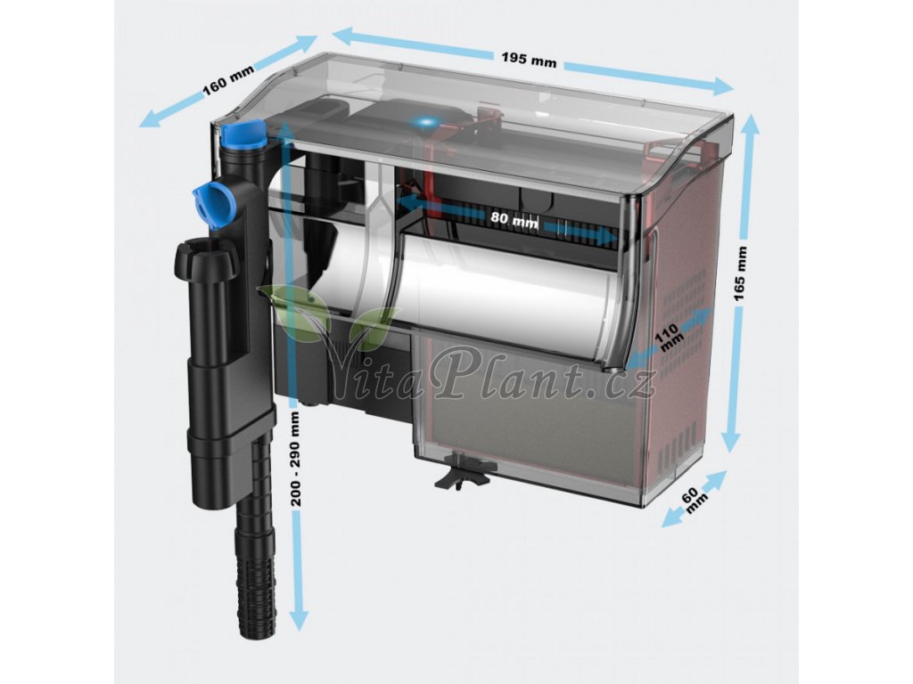 Tento závěsný filtr lze použít pro akvária o objemu od 38 do 115 litrů. Výkon čerpadla je 500 l/hod.